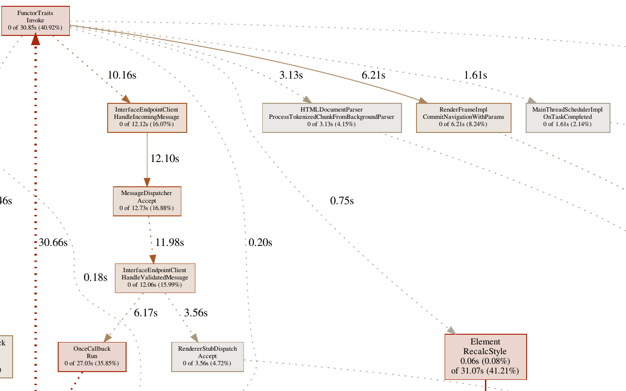 A box represents a function and the more time spent on the function, the bigger the box is. (Note that some functions which consumes a short time are ignored in the figure by default) FunctorTraits::Invoke is a very common function where an asynchronous callback starts, so many functions are derived from it as shown in the figure. Obviously, Element::RecalcStyle takes lots of time, so I’m quite confident that this function is my target and the next step is to add some logs or debugging, which is a good start to explain the reason of slow rendering.