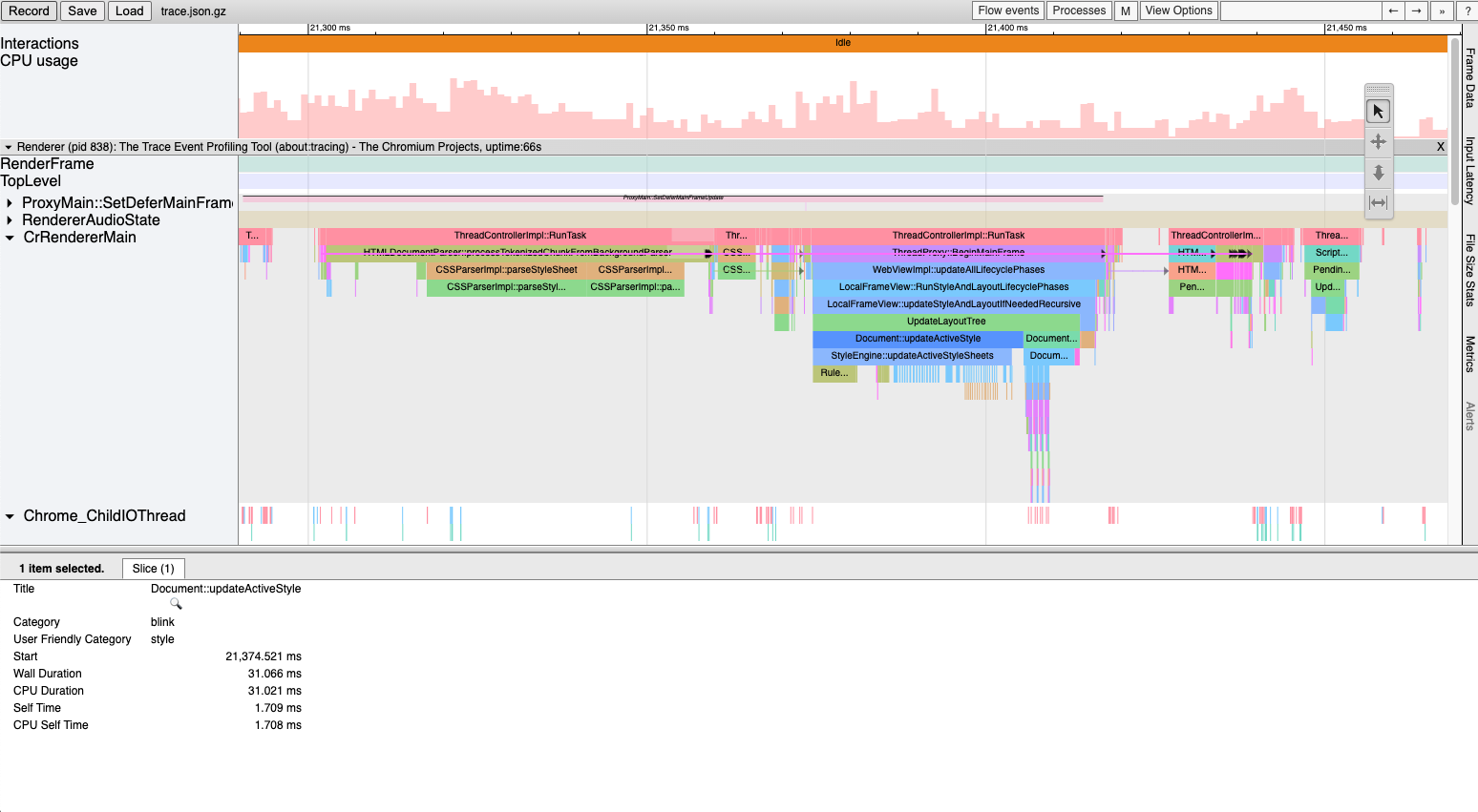 Unlike profiling, a box represents an event in Chromium and parallel events are stacked on the timeline, which means finer granularity. Usually, an event is traced at the beginning of a function. For example, the Document::updateActiveStyle in the figure is defined here.