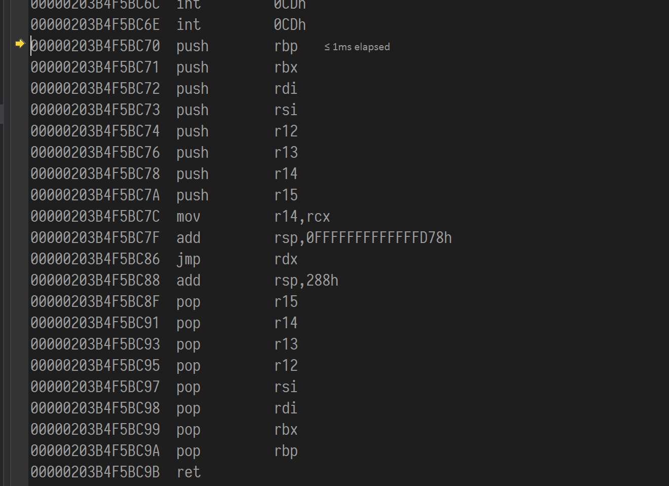 Bingo! The jit-ed code doesn’t follow any existing calling conventions and that confuses RtlUnwindEx and results in a crash. To confirm this, I write a PoC in following steps: