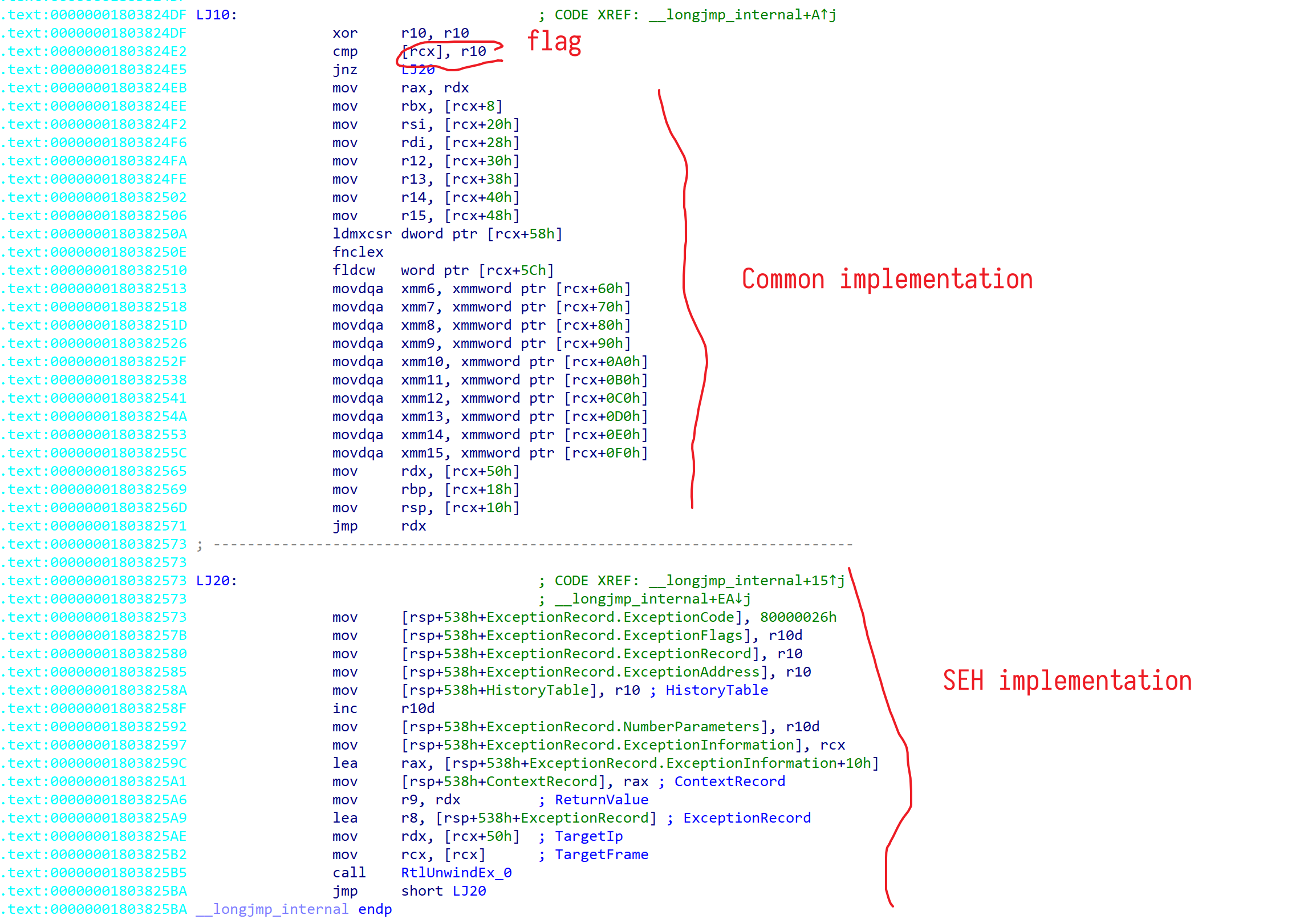 Microsoft puts two longjmp implementations in one fucntion and the first field of jmp_buf (rcx in the figure above) decides which implementation to use. Where does this flag come from?
