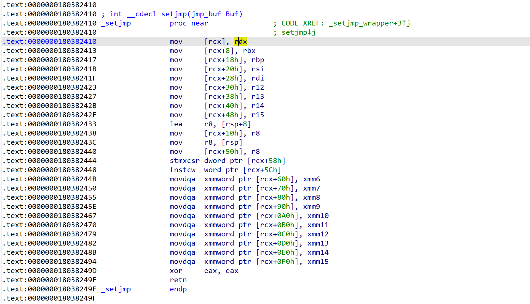 This post is a longer explanation why we need a wrapper for setjmp on Windows x86_64 for Unicorn.