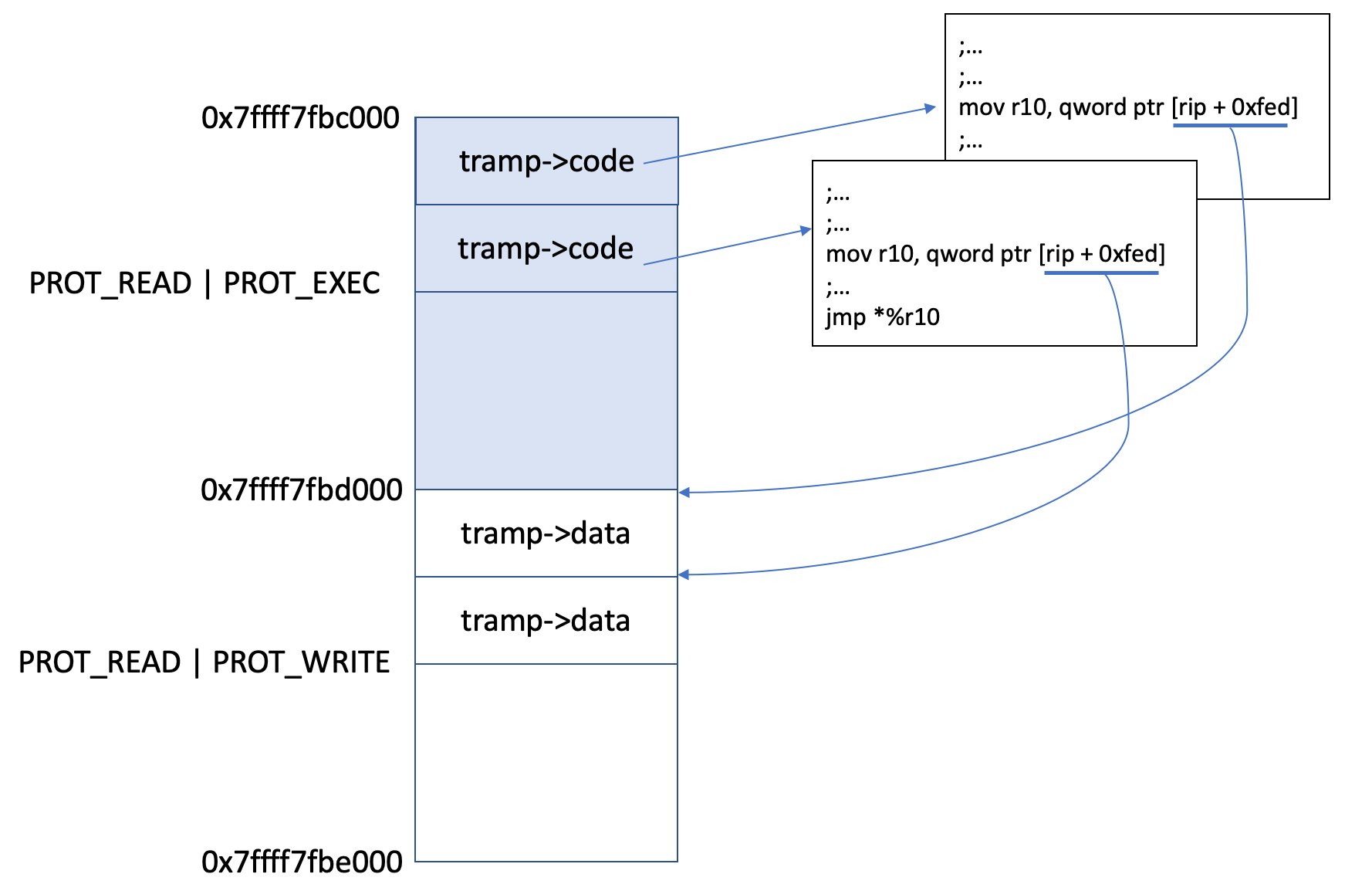 Update(08/01/2021): The Trampoline mechanism also eliminates the need for Writable/Executable memory since the content of the tramp->code is generated at compile time.
